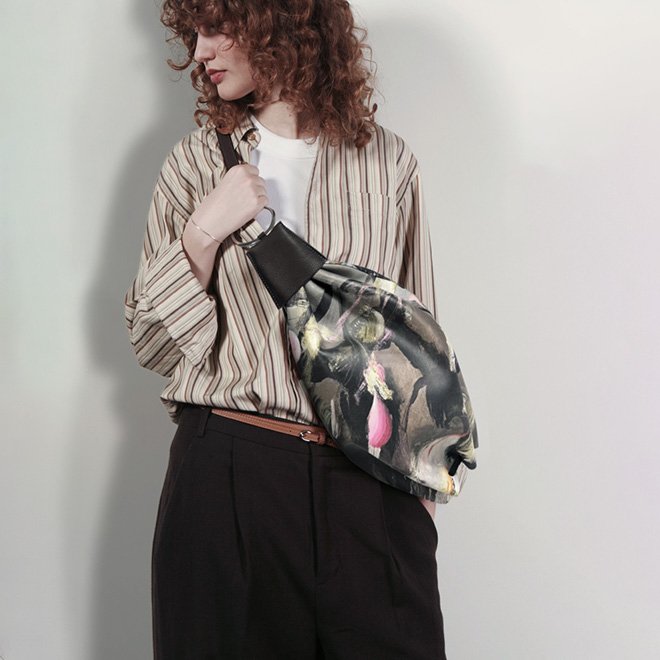Leur corps de cuir souple est imprimé numériquement à partir de détails choisis dans les toiles d’Alain Joséphine. Chaque sac correspond à une portion d’image, à un cadrage singulier. Aucun motif ne se répète. Chaque pièce devient ainsi un fragment d’œuvre, unique, porté au plus près du corps. La forme oblongue et nomade du Carambole révèle encore davantage la vibration de la couleur, comme un paysage en mouvement.